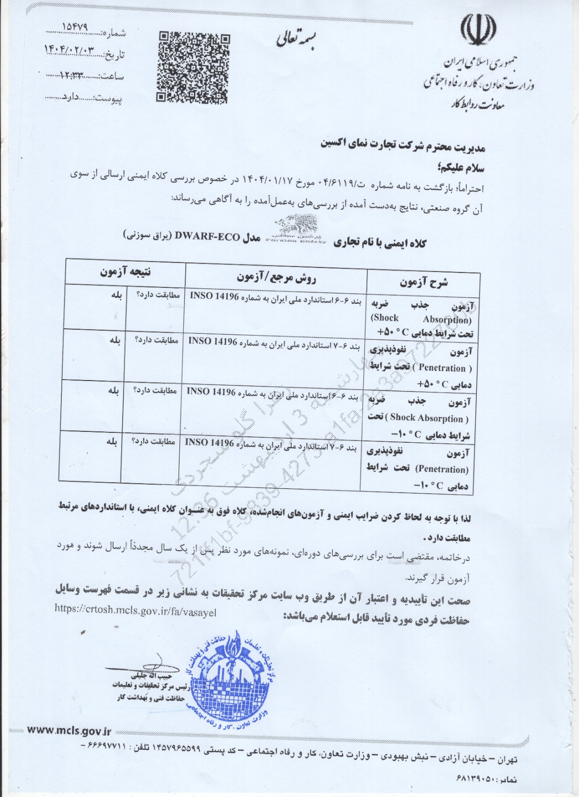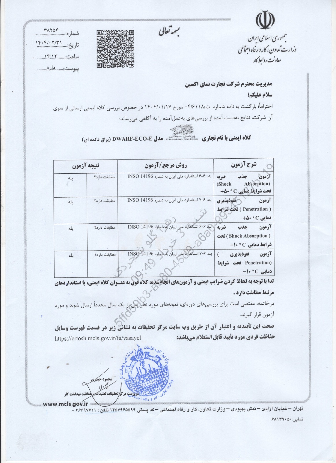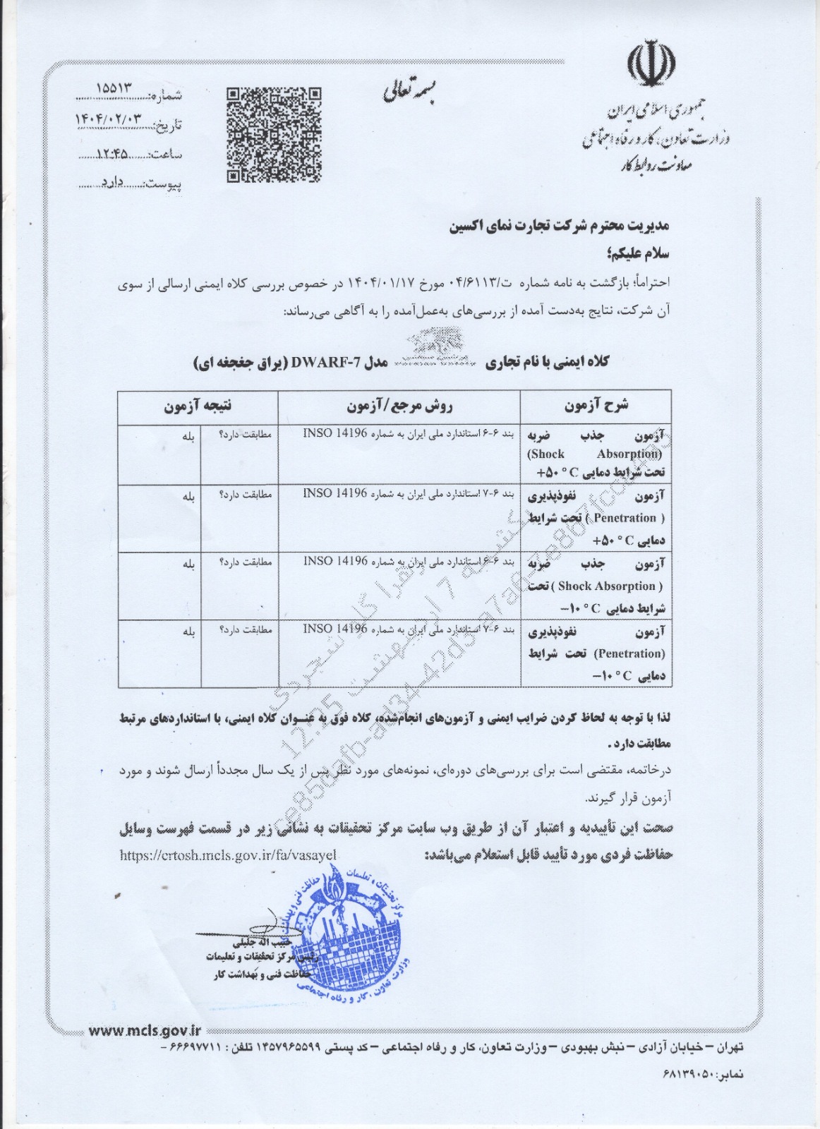 تائیدیه استاندارد برق از پژوهشگاه نیرو برای کلاه ایمنی دورف 7E