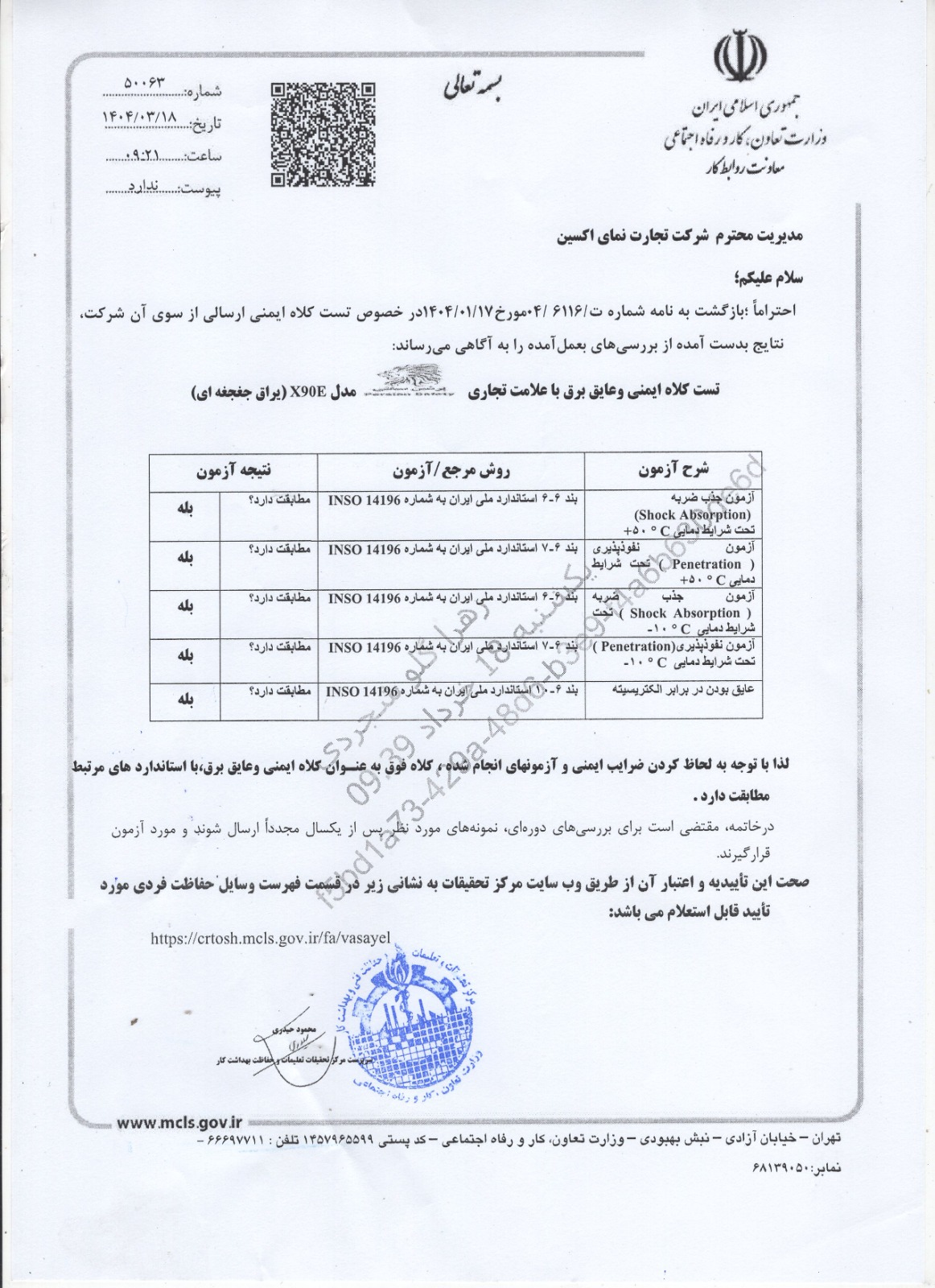 تائیدیه استاندارد برق از پژوهشگاه نیرو برای کلاه ایمنی X90E